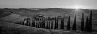 Zonsondergang in Toscane bij de agriturismo met de karakteristieke glooiende cipressen op rij in Asciano.