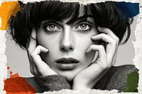 Deze foto is een indrukwekkende samensmelting van klassieke zwart-witfotografie en artistieke kleurelementen. Centraal staat het gezicht van een jonge vrouw wiens blik de kijker direct boeit. De wijd opengesperde ogen, omlijst door verward, donker haar, brengen een mengeling van verbazing, kwetsbaarheid en intensiteit over.