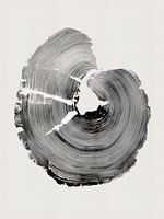 Een minimalistisch abstract kunstwerk met wervelende zwarte en grijze penseelstreken op een witte achtergrond, die een cirkelvormig, draaikolk-achtig patroon vormen met gestructureerde lijnen die naar buiten stralen