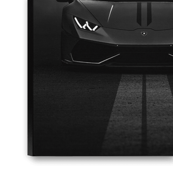 Een krachtige Lamborghini Huracán wordt gepresenteerd in een strakke, gerichte zwart-witte esthetiek. Zijn scherpe, Y-vormige dagrijverlichting snijdt door de duisternis en wordt onderstreept door dikke, agressieve witte racestrepen.