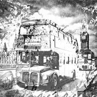 Houses of Parliament is een monumentaal, neogotisch gebouw in Londen waar het Britse parlement bijeenkomt. Een van de typische bussen staat op de voorgrond. Decoratieve en moderne uitvoering van de scène.