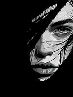 Dit opvallende kunstwerk vangt de mysterieuze en emotionele uitdrukking van een vrouw gehuld in schaduwen en licht. Met een monochroom palet benadrukt het sterke contrasten tussen zwarte, grijze en witte tinten, waardoor een dramatische en impactvolle visuele ervaring ontstaat. De focus op haar doordringende blik en delicate gelaatstrekken verbeeldt diepte, emotie en raadselachtigheid, waardoor het werk een diepgaande verkenning is van menselijke emotie en mysterie. De ingewikkelde details in de schaduwen rond haar gezicht en de fijne textuur van haar haar creëren een levensecht maar surrealistisch effect, waardoor de grenzen tussen werkelijkheid en verbeelding vervagen. De sluier van duisternis om haar heen voegt een sfeer van geheimzinnigheid toe en symboliseert introspectie en verborgen waarheden.
