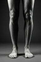 Monochrome studio-opname. Onderbenen en voeten van een staand persoon tegen een donkergrijze achtergrond, egaal belicht.