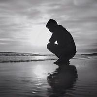 Een aangrijpende zwart-witfoto legt het silhouet vast van een eenzame figuur, vermoedelijk een man, die peinzend neerhurkt aan de rand van het water op een strand. Verlicht door de laagstaande zon, waarschijnlijk tijdens zonsopgang of zonsondergang, staart de persoon naar de zachte golven. Hun duidelijke reflectie glinstert op het natte zand, wat de contemplatieve en eenzame sfeer van de scène versterkt.