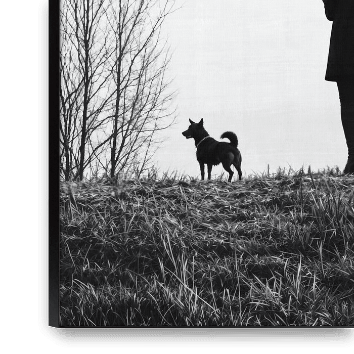 Een grimmige zwart-witfoto met de silhouetten van een vrouw en haar hond vanuit het perspectief van achteren. Ze staan samen op een met gras begroeide heuvel, omlijst door kale winterbomen onder een vlakke, bewolkte lucht. De minimalistische compositie en het hoge contrast roepen een krachtig gevoel op van stille contemplatie,…