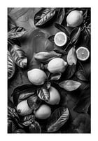 Artistiek monochroom beeld van citroenen en bladeren op een grijze achtergrond.