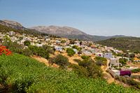 Panoramisch uitzicht op het dorp Monolithos op Rhodos. Landschap met witte huizen, bergen op de achtergrond en groene vegetatie op de voorgrond.