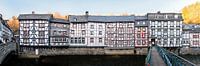 Monschau (Frans: Montjoie), met ongeveer 11.500 inwoners, behoort tot de stadsregio Aken en dankt zijn naam aan kasteel Monschau. Dit aanzicht van eeuwenoude vakwerkhuizen wordt ook wel de Rurpartie genoemd. De rivier de Rur stroomt direct langs het marktplein van Monschau, waardoor de Rurpartie de noordzijde van de markt vormt. Een multi-perspectief compositie uit een fotoserie, meer info is te vinden in het archief op: https://panoramastreetline.com/markt-fluss-rur-fachwerk-monschau-deutschland-P16296