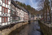 Zicht op de Roer-rivier en de Fachwerk-bouwstijl in Monschau, Duitsland.