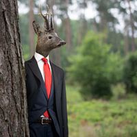 Hert in strak kostuum en rode stropdas in het bos.