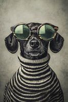 Deze stijlvolle teckel in streeptrui en zonnebril is eigenzinnig, zelfverzekerd en een tikje mysterieus. Met z’n retro brillenglazen en Parijse look past hij perfect in een interieur dat een knipoog kan waarderen.