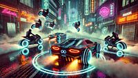 Het cyberpunk-genre combineert hightech toekomstvisies met stedelijke underground flair. Deze poster is een goed voorbeeld van de samensmelting van futuristische technologie en het bruisende stadsleven. De futuristische voertuigen met hun gloeiende banden en dynamische vormen doen denken aan videogames en films als Tron of Blade Runner. De neonverlichte gebouwen en straten creëren een betoverende diepte en nodigen de kijker uit om zich onder te dompelen in deze wereld.