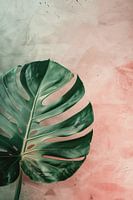 Dit werk laat een enkel Monstera-blad zien tegen een textuurrijke achtergrond. Het blad is krachtig aanwezig, maar niet strak of perfect uitgewerkt. De achtergrond toont zichtbare lagen en subtiele onregelmatigheden, wat het werk een schilderachtig karakter geeft.