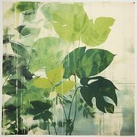 Mixed media afbeelding van bladeren in diverse groentinten op een witbeige achtergrond. Meerdere bladeren worden getoond, waaronder de monstera. Drie-laags afgedrukt, waardoor het een prachtig effect geeft. Passend bij diverse stijlen en trends. Kan ook als drieluik geplaatst worden samen met de afbeeldingen van het kastanje blad en beukenblad.