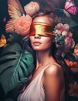 Een kleurrijk protret van een geblinddoekte vrouw, Versierd met tropische bladeren, pioenrozen en droogbloemen. Dit werk heeft een zachter romantische uitstraling, maar benadrukt de schoonheind en vooral de kracht van elke vrouw. Soms hebben we de behoefte om even in ons zelf te keren en te dromen van een prachtige omgeving. Vol mooie bloemen en geurende grassen. In een warme prettige omgeving weer opladen voor een nieuwe dag vol chaos en hektiek.