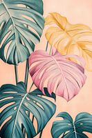 Dit kunstwerk toont een verfrissende interpretatie van tropische monstera-bladeren in een onverwacht kleurenpalet. Tegen een perzikkleurige achtergrond ontplooien zich bladeren in turquoise, geel en roze tinten. Gedetailleerde weergave van nerven en texturen creëert diepte, terwijl pastelkleuren een dromerige sfeer oproepen. De illustratie balanceert tussen weelderige natuur en moderne esthetiek, weerspiegelend de trend van botanische motieven in design. Het werk straalt rust en zachtheid uit, nodigt uit tot reflectie over onverwachte natuurlijke schoonheid, en past in een boho-chic omgeving. De unieke kleurcombinatie evoceert verwondering, als een tropische tuin in een fantasiewereld.
