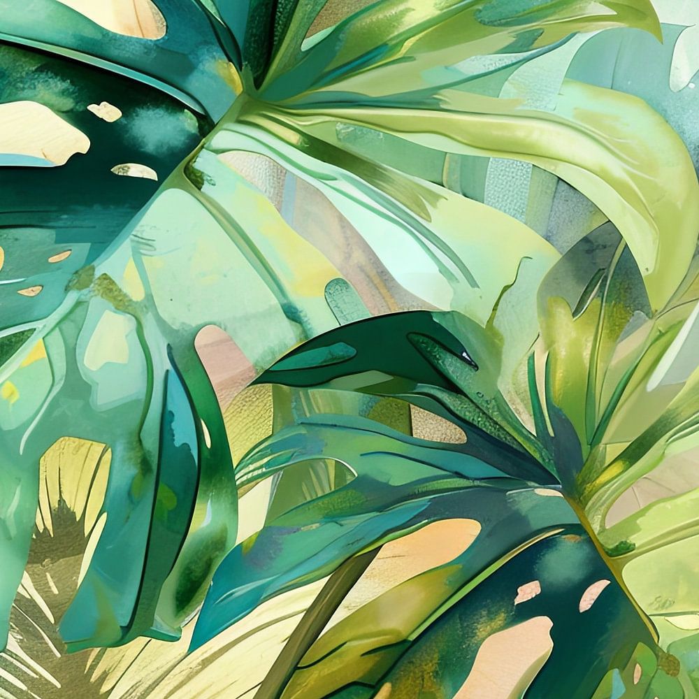 Deze kunstdruk toont verschillende monsterabladeren in een fascinerende, abstracte voorstelling. De weelderige groene tinten en opvallende uitsnijdingen van de bladeren geven het kunstwerk een tropisch gevoel, terwijl de abstracte achtergrond artistieke diepte toevoegt. De zachte overgangen en delicate kleuren maken van deze kunstprint een ideaal decoratiestuk voor woon- en werkruimtes die op zoek zijn naar een mix van natuur en moderne kunst. Deze combinatie spreekt zowel kunstliefhebbers als plantenliefhebbers aan.