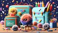 De afbeelding straalt de eerste schooldag uit met levendige kleuren en vrolijke chaos. Het toont een groep pluizige monsters van verschillende grootte en kleur, omringd door schoolspullen. In het midden zit een groot, blauw monster met wijd opengesperde ogen op een miniatuurstoel met een potlood in zijn hand. Voor hem zit een ander enthousiast monster een boek te lezen, terwijl kleinere, even charmante monsters ronddartelen tussen potloden en krijtjes. De scène wordt gedomineerd door een grote, turquoise gekleurde schooltas met het woord "September" erop geschreven. De schooltas is bedekt met kleurrijke, puntvormige versieringen en gevuld met nog meer potloden, wat het begin van een nieuw schooljaar symboliseert. Op de achtergrond is confetti en slingers te zien, die de feestelijke sfeer van deze speciale dag benadrukken. Waskrijtjes, gummetjes en een schrijfblok met het nummer "2" verspreid op de tafel maken het tafereel compleet. De compositie is een explosie van creativiteit en belooft een spannend en leuk leeravontuur.