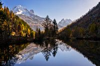 In dit geval wordt het bergmassief weerspiegeld in het bergmeer op de Col des Montets in het noordoosten van de Mont Blanc.