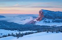 Mont Granier in het Chartreuse gebergte in de Franse Alpen gedurende een kleurrijke zonsondergang. Deze top is 1933 meter hoog en is de noordelijkste top van het gebergte. Een prachtige lokatie voor mooie winteravonturen.