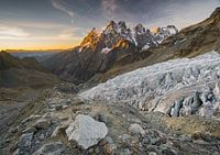 Eerste zonnestralen op het Pelvouxmassief vanaf de linkeroever van de gletsjer blanc ...