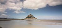 Panorama opname van de bekende Mont Saint Michel in Normandië in Frankrijk. Blauwe lucht met wolken en opkomend tij geven een iets ander zicht op het wereldberoemde Unesco eilandje voor de kust van Bretagne.