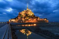 Prachtige landschap opname van middeleeuws monument historique Le Mont Saint-Michel in Bretagne, Frankrijk, na zonsondergang in het blauwe uur vanaf de loopbrug tijdens laagwater met reflectie in het water