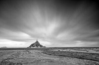 Prachtige zwart-wit landschap opname van middeleeuws monument historique Le Mont Saint-Michel in Bretagne, Frankrijk, met lange sluitertijd en langstrekkende wolken