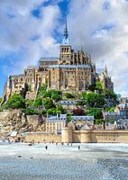 Kloostereiland Mont-Saint-Michel bij eb in de zon tegen een blauwe lucht in Normandië, Frankrijk