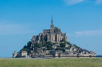 De majestueuze burchtstad met de wonderschone abdij boven op de rots tijdens eb. Op een mooie zomerdag met blauwe lucht en mooie wolken.