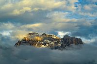 De Monte Civetta in de Dolomieten omgeven door wolken tijdens zonsondergang na een mooie lentedag. De Civetta is een prominente en belangrijke berg in de Dolomieten en is populair bij bergbeklimmers omdat het een van de hoogste rotsformaties in Europa is.