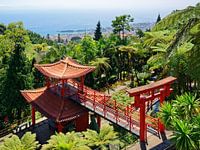 In Monte, een stadje boven Funchal, ligt een bekende botanische tuin genaamd "Monte Palace Madeira Tropical Garden". Het is een populaire bestemming voor toeristen uit de hele wereld. Funchal met zijn cruisehaven is in de verte te zien. Genomen in het voorjaar van 2023.