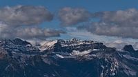 Landschapsopname van de ruige, met sneeuw bedekte toppen van Mount Brett (2.984 m) in de Massive Range op een zonnige dag in de herfst met bewolkte hemel in de Rocky Mountains in Banff National Park, Alberta, Canada.