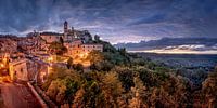 De laatste gloed van de zonsondergang is sfeervol boven de stad Montepulciano in Toscane.