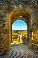 Monteriggioni, middeleeuws versterkt dorp, oude stadspoort en Via Francigena, provincie Siena, regio Toscane. Italië, Europa