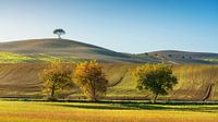 Monteroni d'Arbia, bomen en velden langs de route van de via Francigena in de herfst. Provincie Siena, regio Toscane. Italië, Europa.