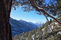 De Durance-vallei nabij Montgenèvre op een zonnige winterdag, met de besneeuwde toppen van het Écrinsmassief in de verte.