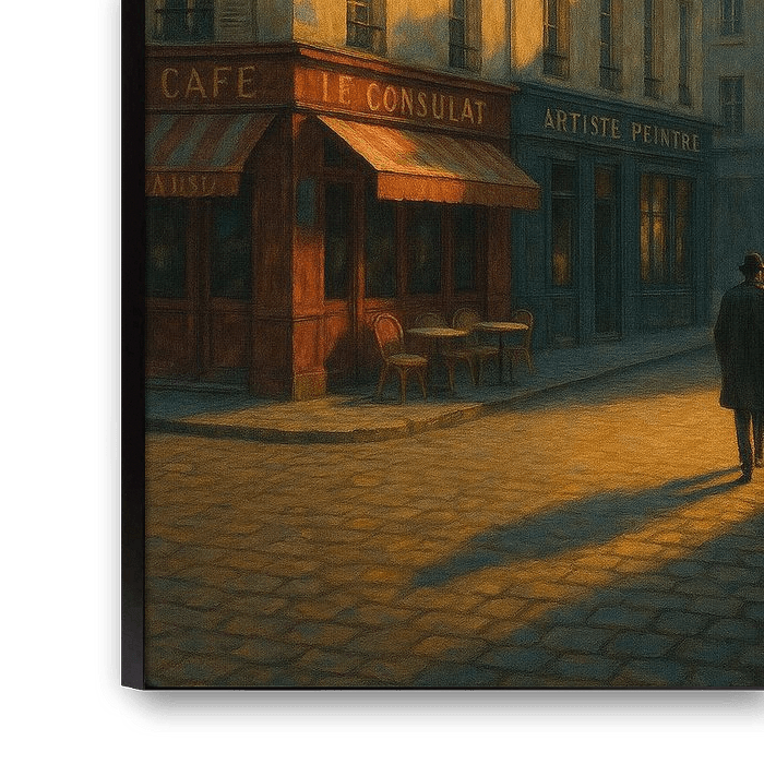 Montmartre Afternoon Glow vangt de poëtische stilte van Parijs aan de rand van de dag. Het zachte licht valt door de smalle geplaveide straatjes en wast de gevels van oude cafés en ateliers in gedempt goud. In de verte rijst de witte koepel van de Sacré-Cœur op als een droom boven de daken, sereen maar monumentaal. De eenzame figuur die door de straat loopt roept de stille contemplatie van Edward Hopper op, waar eenzaamheid schoonheid wordt en afwezigheid aanwezigheid.