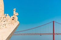 Het monument Padrao dos Descobrimentos met Hendrik de Zeevaarder en de brug Ponte 25 de Abril in Belém, Lissabon, Portugal.