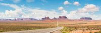 Een panorama van U.S. Highway 163 en Monument Valley in de Verenigde Staten. Via deze Highway rijdt men dwars door Monument Valley in Utah en Arizona. Deze foto kijkt uit over Monument Valley en Highway 163 in Zuidelijke richting.