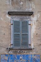 Een verweerde muur met al even verweerde blauw-grijze luiken van een monumentaal pand in het centrum van het prachtige Italiaanse stadje Domodossola.
