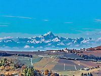 Monviso en Langhe. Een adembenemend uitzicht op besneeuwde Alpentoppen die de horizon domineren, met een levendig landelijk landschap op de voorgrond. Glooiende velden, wijngaarden en charmante dorpjes met historische kerkjes creëren een sereen en pittoresk tafereel. De levendige blauwe lucht draagt bij aan de rust en grandeur van de omgeving.