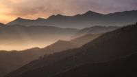 De lucht was helder, en tussen de bergkammen hing een sluier van nevel, precies dat mysterieuze laagje waar ik op hoopte. Terwijl de zon langzaam opkwam, kleurde de hemel in zachte tinten van paars en goud. De gelaagde bergtoppen ontvouwden zich als een grafisch patroon, elk met hun eigen textuur en toon.