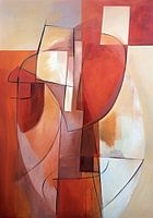 Abstract figuratief met een combinatie van kubisme en lijntekening elementen in warme rood tinten.