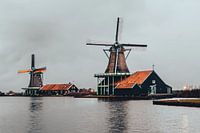 De windmolens van de Zaanse Schans op een moody herfstdag met donkere wolken.