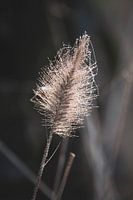 De prachtige bloemaren van Pennisetum alopecuroides, verlicht door de zon en bedekt met vroege ochtenddauw. Ook bekend als Lampenpoetsersgras of vossenstaartgras. Prachtige winternatuur in subtiele natuurtinten.