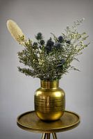 Stilleven van een boeket bloemen in gouden vaas op een goud kleurige standaard