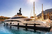 Mooi groot jacht in de haven van Monaco aan het einde van de dag met een mooie zonsondergang.