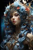 Dit digitaal gemaakte werk is een fantasie portret in mooie rustige tinten en zachte bloemen. Een mooi werk voor aan de muur.