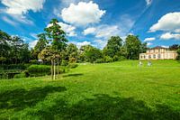 Over ‘Mooi park in de lente met klein kasteel op groene heuvel voor blauwe hemel met witte wolken’ van pixxelmixx